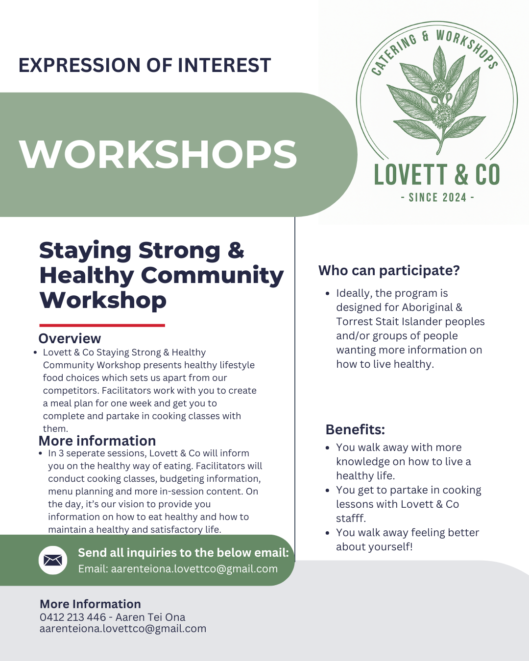 Lovett & Co was opened by Aaren Tei Ona-Lovett on the 7th of October 2024. Soon after, Aaren had introduced Dianne Attard-Lovett to the business and later became Co Founders of Lovett & Co. Their journey begins as a hobby and becomes much more that that. From such a young age, Dianne had always dreamed of owning a business. Aaren was her push to get into the industry and start what they have built today. Aaren and Dianne have a commitment that Lovett & Co will deliver healthy and nutritious catering to their communities, and support their indigenous community in any way they can.